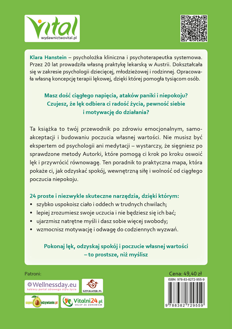 Czy masz już dość życia w ciągłym napięciu? Czujesz, że niepokój, stany lękowe i ataki paniki coraz częściej odbierają ci radość? W książce Klary Hanstein, cenionej psycholożki i psychoterapeutki, znajdziesz praktyczne wskazówki, jak pozbyć się lęku i odzyskać poczucie spokoju oraz bezpieczeństwa. To nie teoria, a zestaw skutecznych narzędzi, które pomogą ci budować poczucie własnej wartości, wzmacniać samoakceptację, motywację i dbać o swoje zdrowie.
