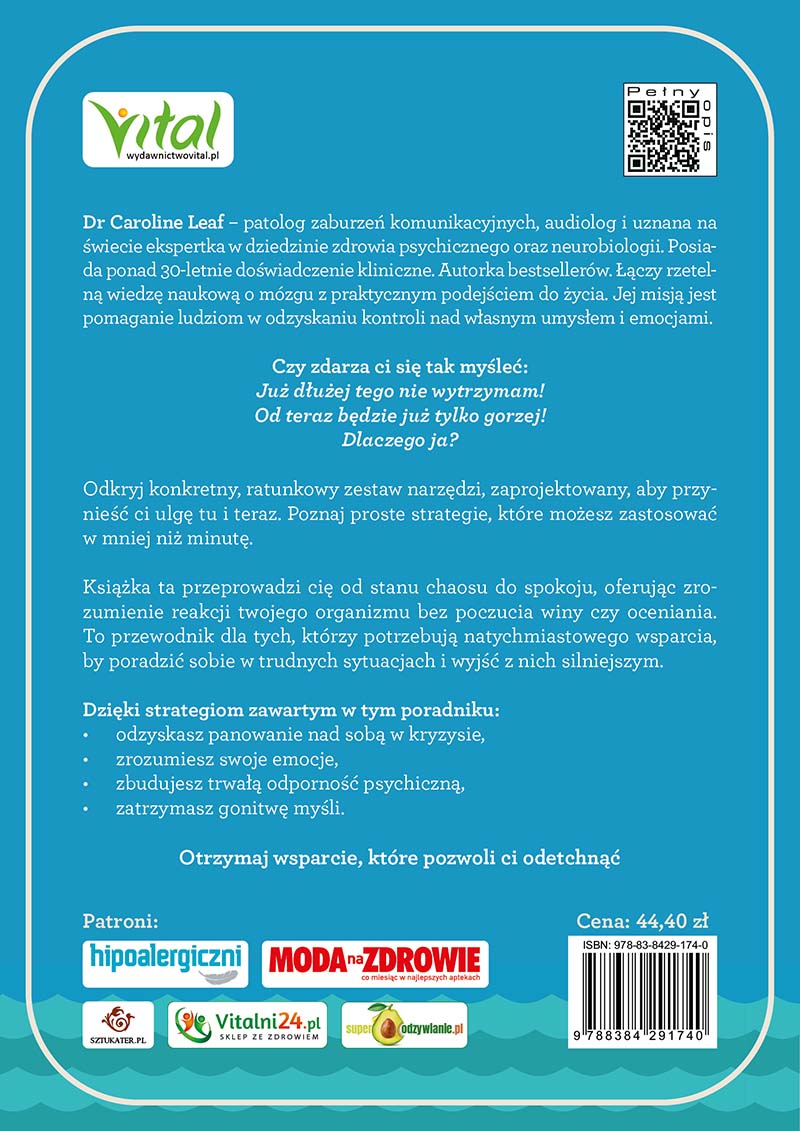 Głównym celem tego poradnika nie jest wieloletnia terapia ani szukanie odległych przyczyn twoich problemów. Książka dostarczy ci narzędzi do natychmiastowego zastosowania. To swoista apteczka pierwszej pomocy emocjonalnej. Kiedy czujesz, że stres paraliżuje twoje ciało, a lęk odbiera zdolność logicznego myślenia, potrzebujesz prostych i szybkich rozwiązań. Dr Caroline Leaf opiera się na ponad 30-letnim doświadczeniu klinicznym. Tłumaczy skomplikowane relacje na linii umysł–mózg–ciało w niezwykle przystępny sposób. Dzięki temu zrozumiesz, że twoje reakcje są naturalne. A co ważniejsze, nauczysz się je kontrolować, zanim one przejmą kontrolę nad tobą.