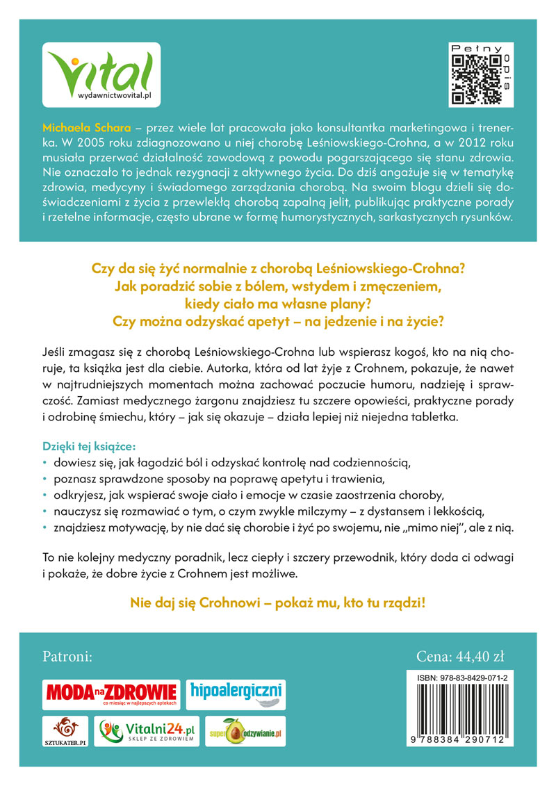 Michaela Schara przeszła drogę od konsultantki marketingowej do ekspertki od własnego zdrowia. Bohaterka, która wie, jak wygląda IBD od środka; jej historia pełna lekarzy, badań i zwrotów akcji; oraz rozwiązania, które pomagają żyć normalnie. Jest merytorycznie, ale jednocześnie ludzko i ciepło – z anegdotami i sarkastycznym uśmiechem do „drogiego pana Crohna”.