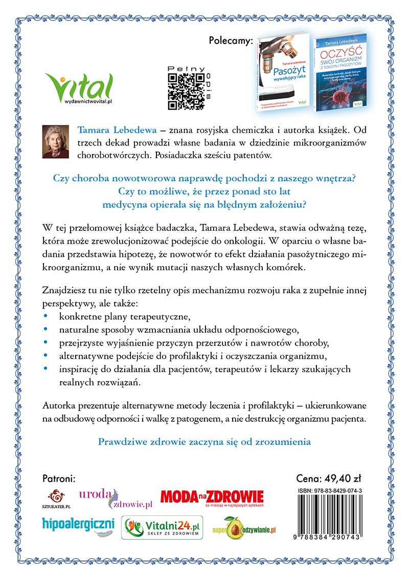 Tamara Lebedewa jest chemiczką z wieloletnim doświadczeniem badawczym i autorką patentów, a swoje wnioski buduje na pracy laboratoryjnej i współpracy z lekarkami praktykującymi holistyczne podejście. W książce dzieli się wynikami obserwacji oraz opisami praktycznych schematów, które – jak podkreśla – były stosowane w realnych przypadkach klinicznych. Nie jest to jednak obietnica cudownego rozwiązania, lecz alternatywna rama interpretacyjna, którą możesz rozważyć wraz ze swoim zespołem terapeutycznym. Dzięki temu masz szansę poszerzyć perspektywę i mądrze łączyć różne źródła wiedzy. To wartościowe zwłaszcza wtedy, gdy szukasz odpowiedzi poza standardem i chcesz świadomie dopytywać o różne możliwości.
