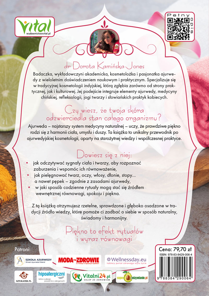 Poradnik ajurwedyjski Doroty Kamińskiej-Jones nie jest po prostu kolejną książką o kosmetykach naturalnych. To zbiór zaawansowanej wiedzy i sprawdzonych zaleceń, jak każdego dnia praktykować rytuały piękna i zdrowia w zgodzie ze swoim typem konstytucyjnym i rytmem natury. Tym samym książka pomoże ci wprowadzić zmiany w sposobie życia i pielęgnacji. Nie tylko poprawią kondycję twojej skóry, ale również pogłębią twoją samoświadomość i równowagę życiową.