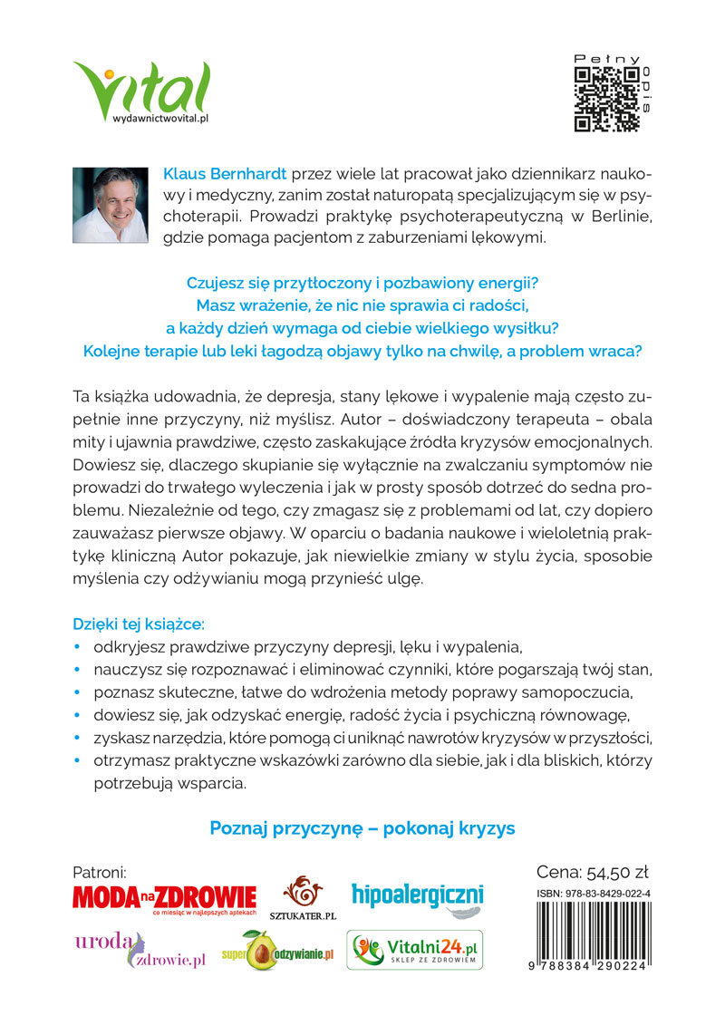 Klaus Bernhardt jest naturopatą specjalizującym się w psychoterapii. Prowadzi praktykę w Berlinie, w której pomaga osobom z zaburzeniami lękowymi i kryzysami emocjonalnymi, łącząc perspektywę medyczną, biologiczną i społeczną. W książce buduje most między nauką a praktyką: przywołuje badania (BDNF, kynurenina, metabolizm komórkowy), a zarazem tłumaczy je w lekki, „kumpelski” sposób. Bez moralizowania i bez fajerwerków – za to z naciskiem na konkret i rezultaty.